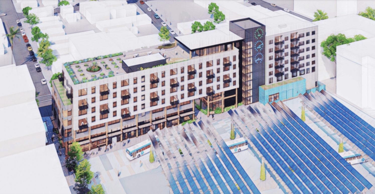 A rendering of Pacific Station North and the rebuilt Metro transit depot, looking from Front Street toward Pacific Avenue. Credit: City of Santa Cruz