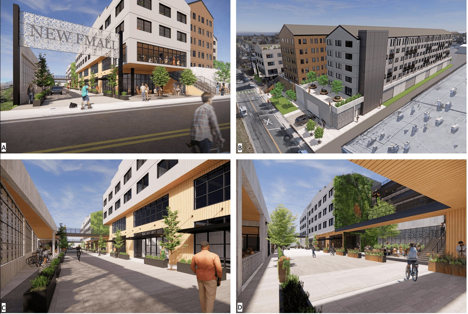 This development will consist of 120 units between 1-3 bedrooms, residential amenities, and industrial and commercial spaces. The property will have a large, 6 level, 223,692 square foot residential building, split lengthwise with a pedestrian space in between and a parking garage on the first few levels. One side of the split will be 6 stories, the other side will be 4. The first two levels will also have commercial and industrial space as well. In front is also a smaller wedge shaped, 2 story building with a terrace on top that will also contain commercial and industrial spaces.